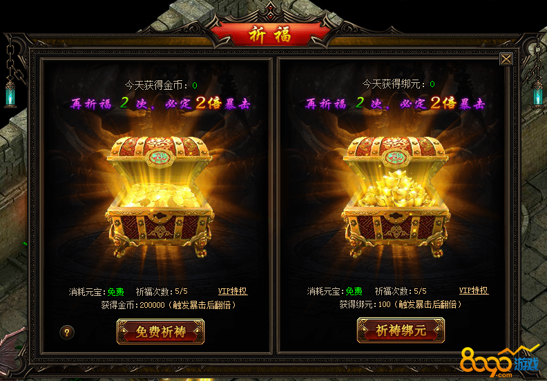 金币祈福和绑元祈福每天可使用5次,玩家的VIP等级越高,可祈福的次数越多。