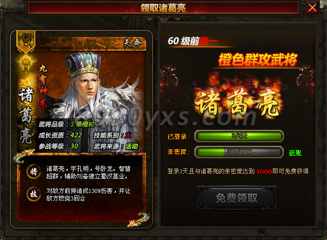 答:想要3天得到诸葛亮需要在首日内主线任务击败诸葛亮,从而激活免费得到诸葛亮的活动图标。即便如此也需要您在3天内积累足够友好度才能够得到他,友好度的增加在该活动图标中有详细注解。