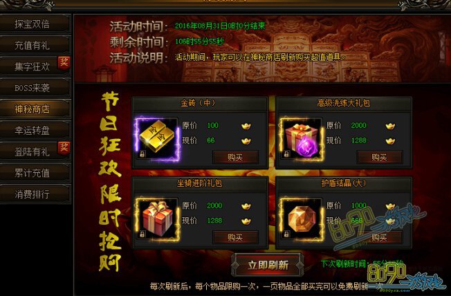 活动时间内,可以在神秘商店中刷新购买超值道具,海量道具超低折扣,快快行动吧!