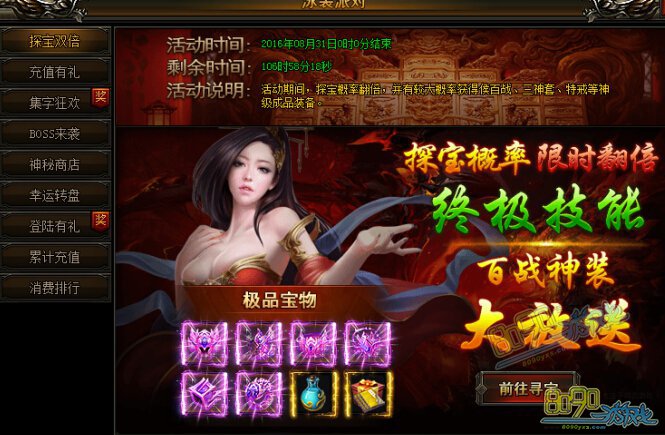 活动时间内探宝获得极品道具概率翻倍,并有概率获得侯·百战、三神套、特戒等成品装备和终极技能礼包