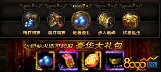活动期间,累计消费指定元宝数额即可领取大奖!达成消费元宝条件可直接领取14转不朽装备随机包、传世宝箱。