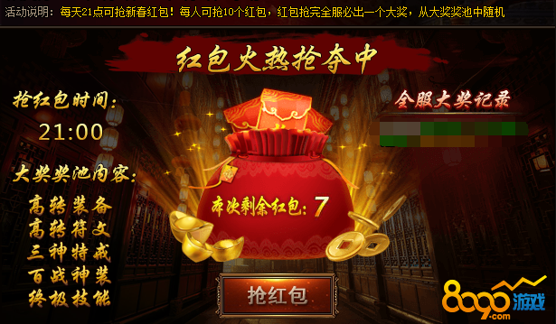 活动期间,每天21点可抢新春红包!每人可抢10个红包,红包抢完全服必出一个大奖,大奖从奖池中随机产出。该活动从1月25日起开启,请留意游戏内的活动时间。