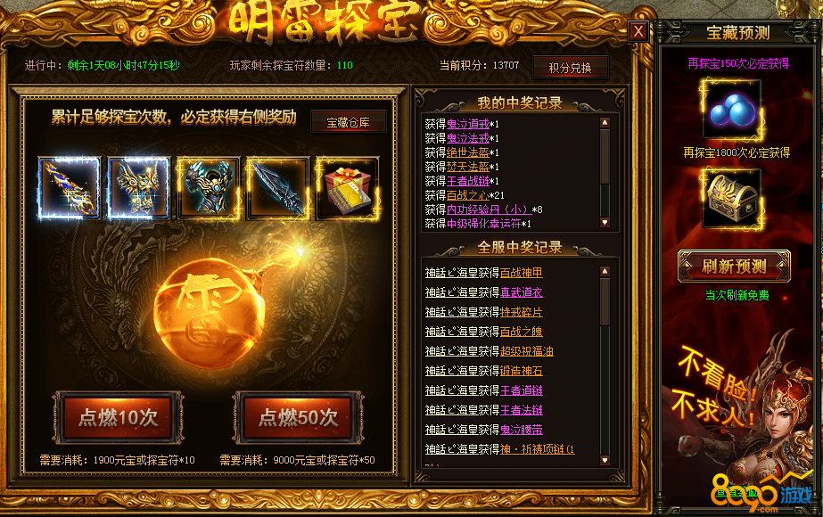明雷探宝赢豪礼,极品时装送不停!右侧能刷新出“新婚时装”,14转装备等极品道具!达到探宝次数必定获得,再也不怕自己是非酋了!!