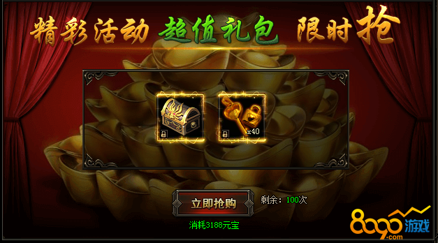 活动期间,每天可以抢购100次神奇礼盒与同心锁。神奇礼盒概率获得如:终极技能书,12转随机装备,14转随机装备等极品道具!