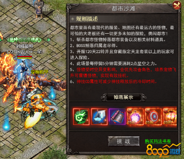 3、 条件:开服120天转生达到21转,并且天龙装备全套5阶可进入
