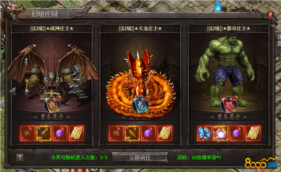 3、 条件:开服120天转生达到21转,并且天龙装备全套5阶可随机进入