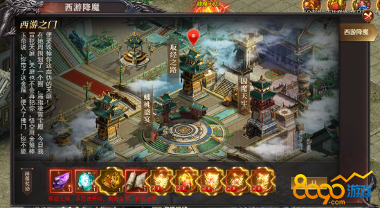 西游大陆玩法内容模块:西游大陆主城、西游之路、囚魔天牢、蟠桃盛宴、全新西游装备