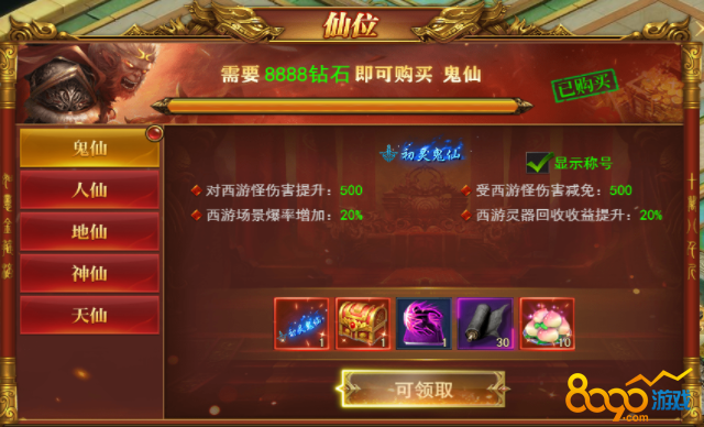 3.一共6个仙位,鬼仙、人仙、地仙、神仙、天仙获取对应的伤害提升,伤害减免,爆率增加,回收收益增加,极高的提升打怪效率
