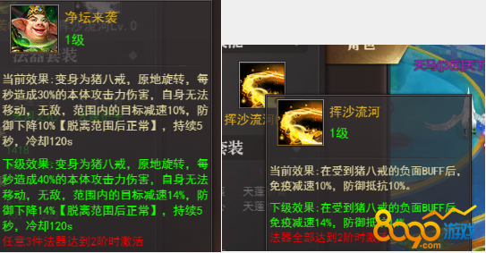 大圣套装单件即可激活,大圣驾到技能,两件技能效果叠加,装备等级越高,大圣降临造成伤害越高