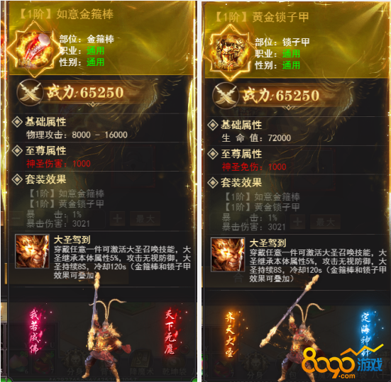 4、特殊装备:大圣套装(如意金箍棒+黄金锁子甲)可激活技能大圣驾到,攻击无视防御