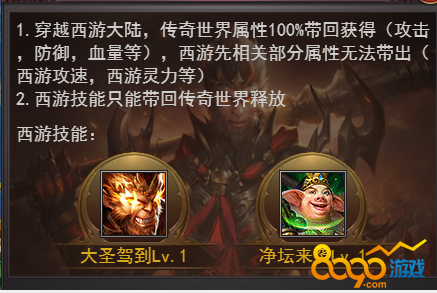 2.西游大陆时空具有大圣和八戒,故西游召唤技能只能带回传世世界释放