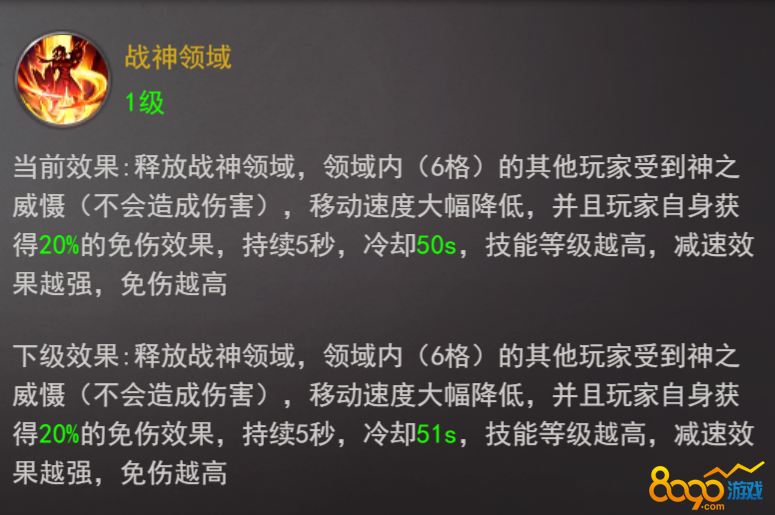 领域效果: 释放战神领域,领域内 (6格)的其他玩家受到神之威慑 (不会造成伤害),移动速度大幅降低并且玩家自身获得免疫效果。技能等级越高,减速效果越高,免伤越高