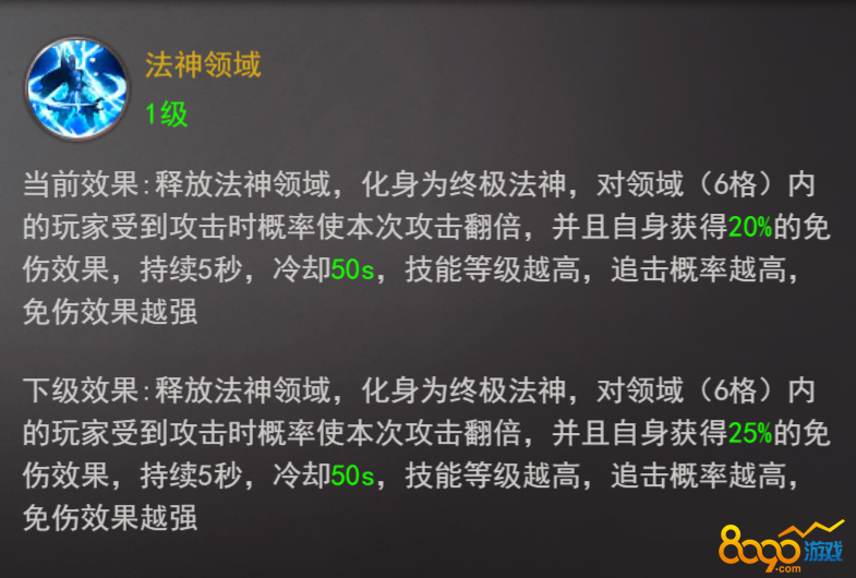 领域效果:释放法神领域,化身为终极法神,对领域 (6格)内的玩家受到攻击时概率使本次攻击翻倍,并且自身获得免疫效果,技能等级越高,追击概率越高,免疫效果越强