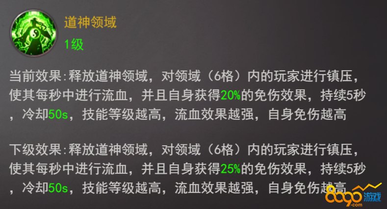 领域效果:释放道神领域,对领域 (6格)内的玩家进行镇压,使其每秒中进行流血,并且自身获得免疫效果,技能等级越高,流血效果越强,自身免伤越高