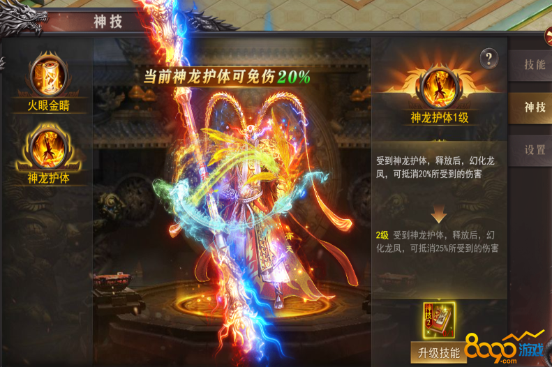 效果说明:受到神龙护体,释放后,幻化龙凤,可抵消所受到的伤害,持续一定时间(pvp和pve生效)