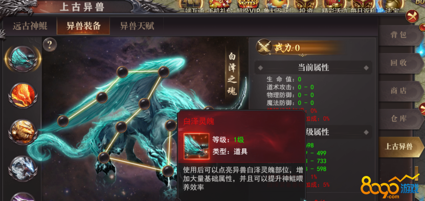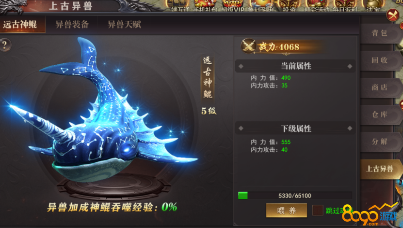(1).喂养道具可以获取神鲲经验,概率获取异兽装备和碎片