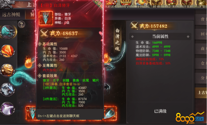 (3).装备合成:通过神鲲喂养获取异兽碎片,碎片可以合成异兽装备