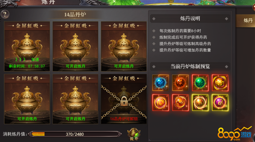 2.炼丹时间:炼制丹药为8小时一次,最多可同时开启6炼丹