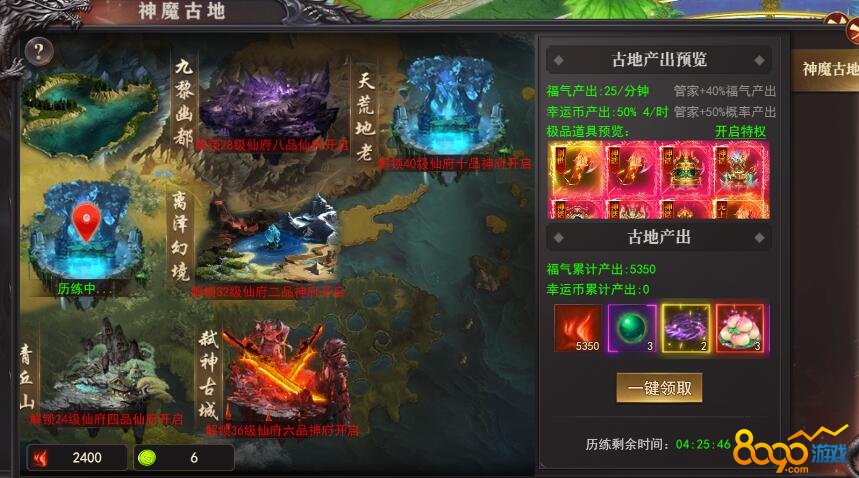 4.仙府奖励:仙府每提升1级,可获得丰厚的奖励(攻击丹、锻古丹、神级器灵之魂等)