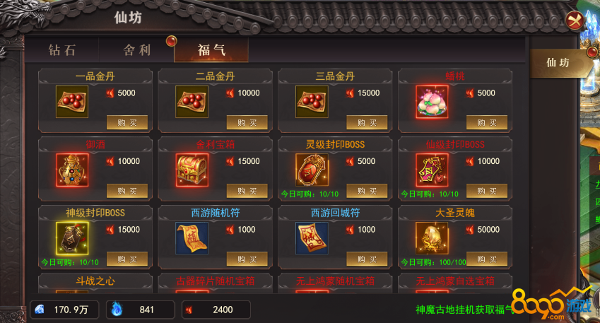 (1)福气兑换:仙府获得的福气可用来兑换商城道具