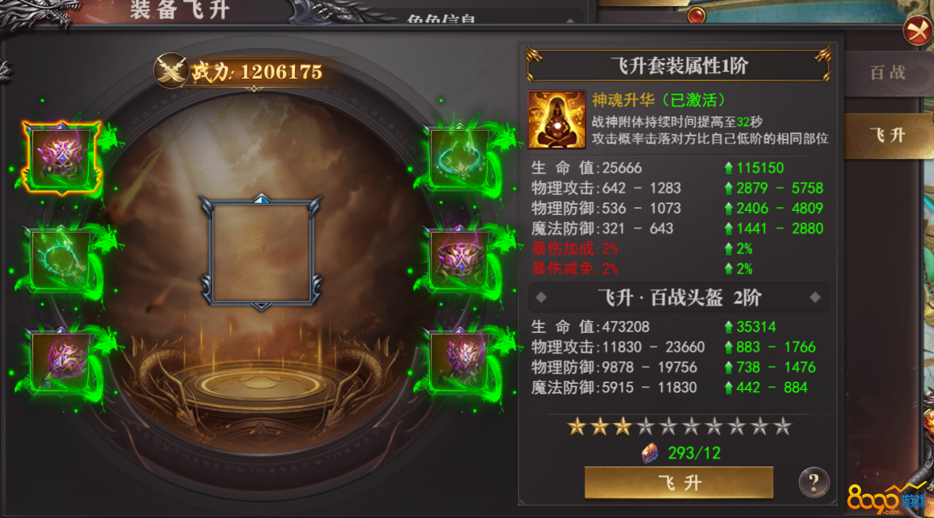 (1)穿戴百战装备才可以进行飞升,且穿戴百战装备时飞升属性才会生效