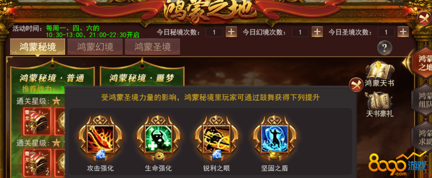 3.新增鸿蒙副本鼓舞:元宝鼓舞、金币鼓舞、钻石鼓舞(攻击强化、生命强化、锐利之眼、坚固之盾)