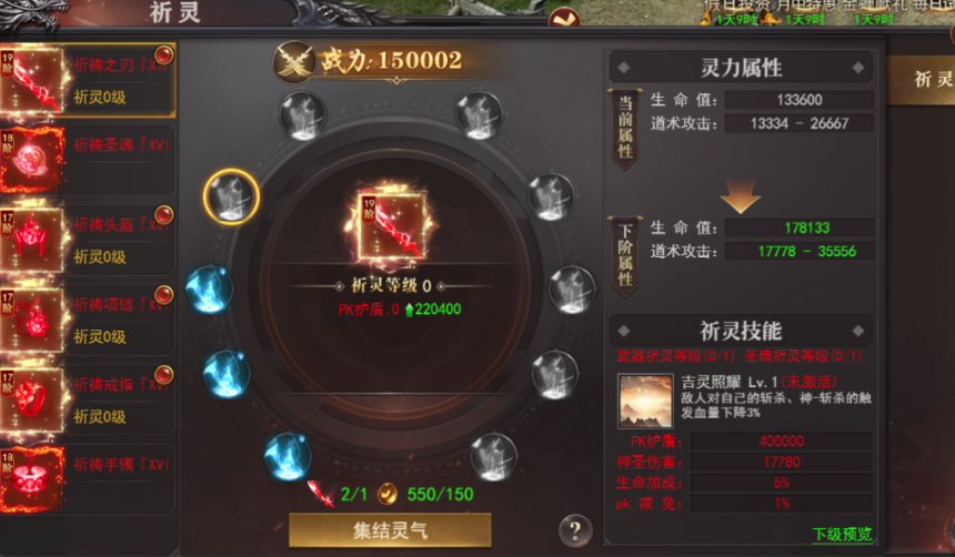 (2)集结十次灵气后可进行祈灵提升祈灵等级,祈灵可提升祈灵属性和灵力属性