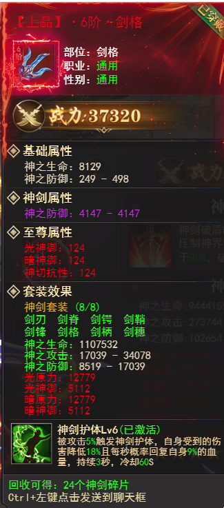 套装属性:神之生命、神之攻击、神之防御、光原力、暗原力、光神御、暗神御