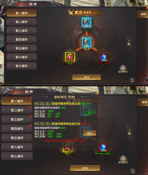 (3)对应魂环达到一定等级可激活驱暗神光(黑暗神殿视野范围提升,提高神之生命/攻击/防御)