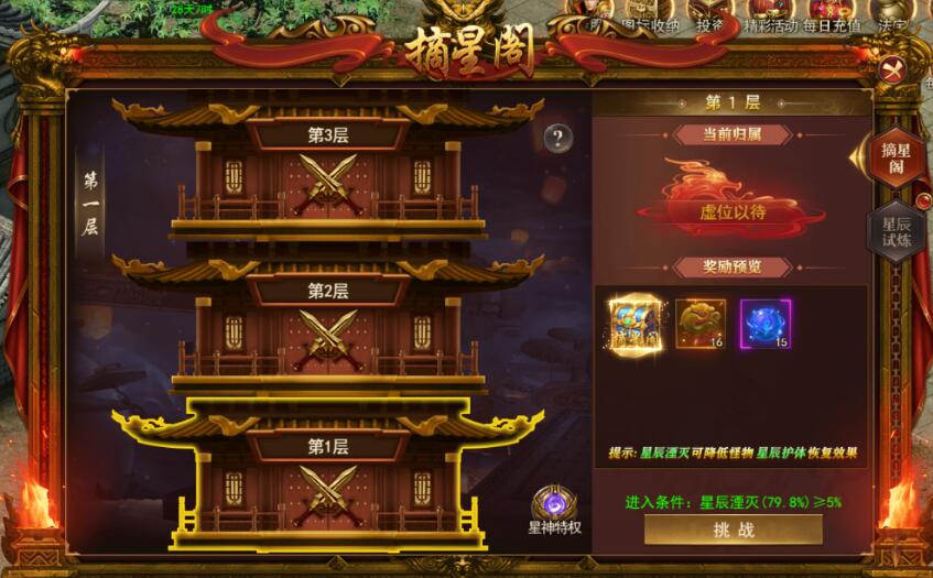 2.摘星阁每层按照星辰湮灭值进行开启,开启后可击杀对应BOSS