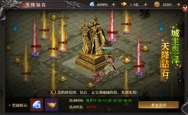 1. 活动开启后,将在王城安全区附近的随机生成多个钻石、元宝的采集物。