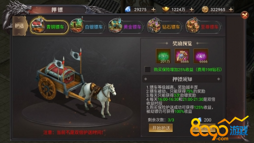 5. 购买保险,单次押镖没有被劫镖,则单次可获得125%的押镖奖励。