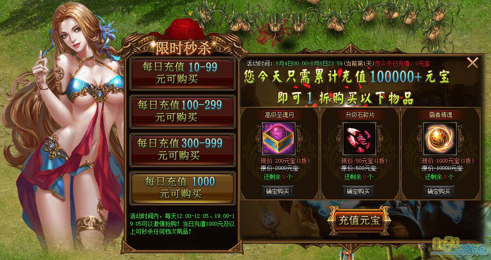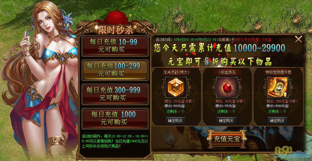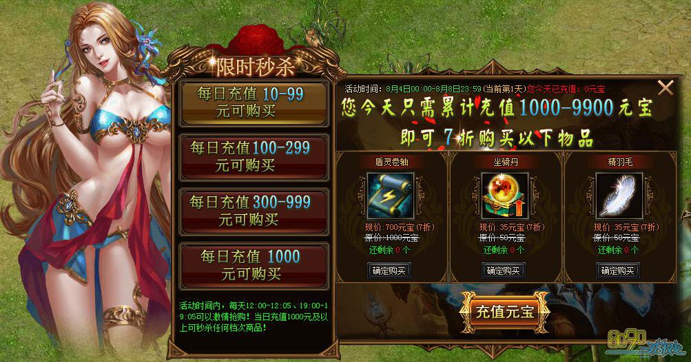 PS:充值符合第一档次的玩家可以购买第一档的商品;符合第二档的玩家可以购买2档的任意商品,依次类推:每日充值1000元的玩家可以秒杀所有商品。