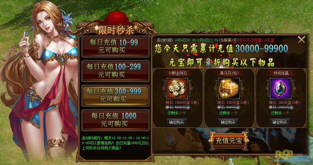 在活动规定时间内出现打折商品,满足充值条件的玩家可进行对应档次商品的抢购,同一个玩家可抢购多件商品