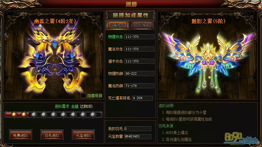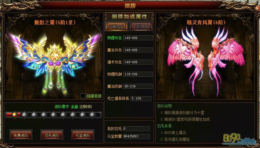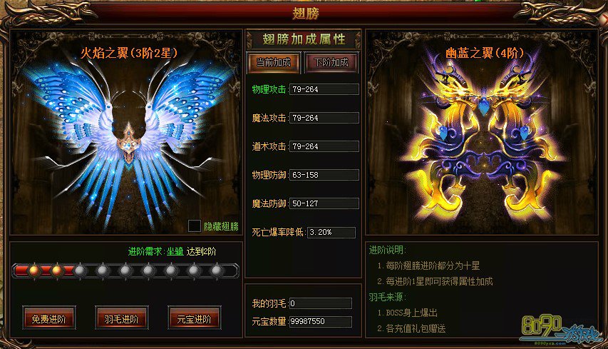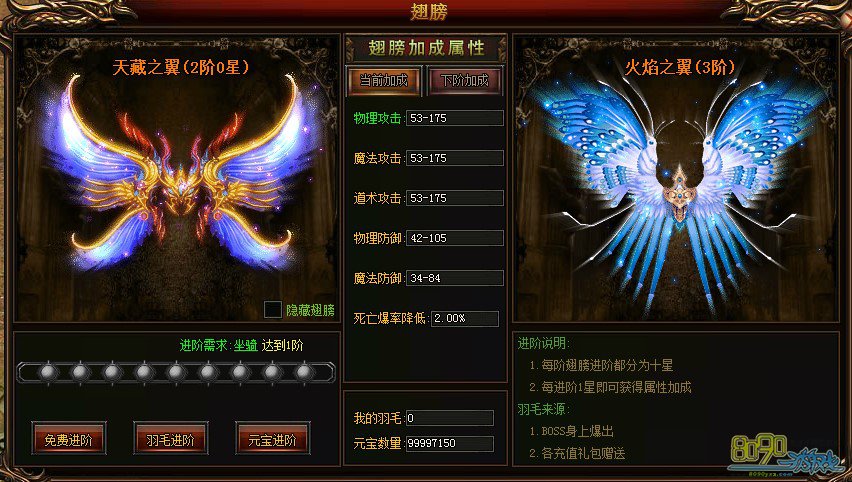 玩家等级达到52级,系统会自动赠送初级翅膀,初级翅膀可进行进阶到最高阶翅膀。翅膀的进阶有三种方式:1.每天免费进阶,有限制次数;2.精羽毛进阶;3.元宝进阶。适合不同类型玩家的玩法,给人物加成属性也比较高。