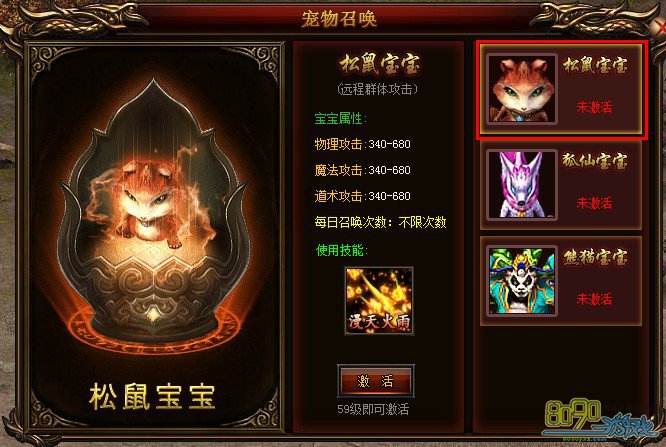 人物达到59级可激活系统赠送的第一只宝宝:松鼠宝宝。累积登陆7天,玩家可激活第二只宝宝:狐狸宝宝。成为VIP2玩家可激活第三只宝宝:熊猫宝宝。三只宝宝全是群体攻击,威力惊人,绝对是杀怪升级以及牵引BOSS的好帮手。