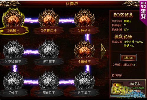 每日玩家可以挑战8次boss,这边给玩家推荐下,挑战boss的时候,攻击药水什么的买上准没坏处。其次说下伏魔塔额奖励吧,主要奖励道具就是绑定金币跟声望值啦。