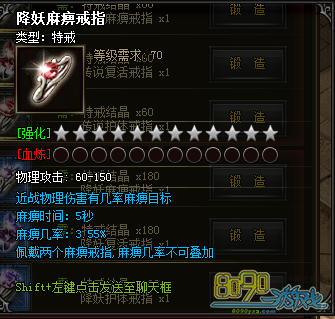 那么想要麻痹戒指的获得方法就是需要玩家用特戒结晶加上传说的麻痹戒指进行合成。具体是60个特戒结晶加一个传说麻痹戒指。