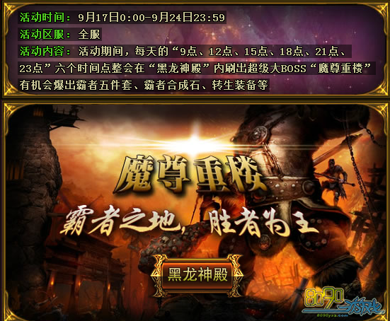 首先boss魔尊重楼刷新地点是黑龙神殿。刷新时间是每天9点,12点,15点,18点,21点,23点。
