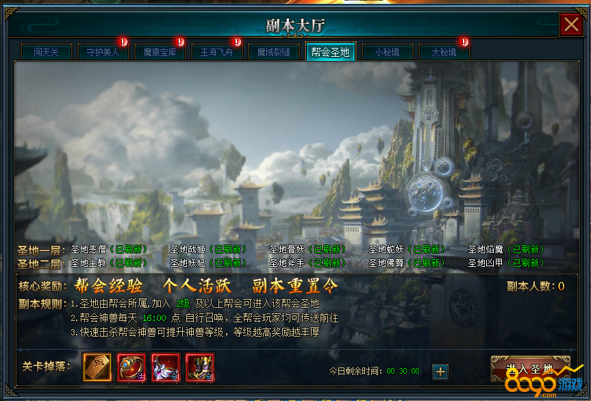 值得一提的是,每天有一定的时间可以进入帮会圣地,若时间不足可以消耗灭魔令购买时间!