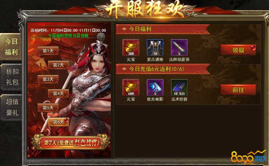 活动一:今日福利,开服7天每天都可领取丰厚的奖励,第七天更有红色战将等你领取。