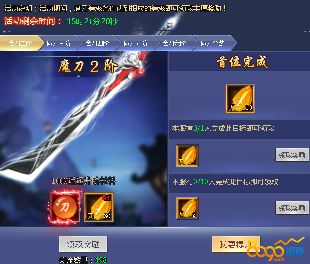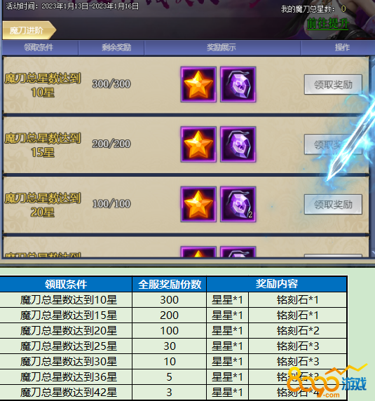 活动说明:魔刀达到指定星数的玩家可领取对应奖励,数量有限先到先得!