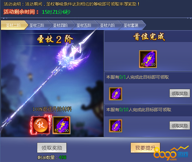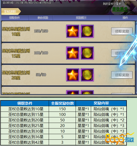 活动说明:圣杖达到指定星数的玩家可领取对应奖励,数量有限先到先得!