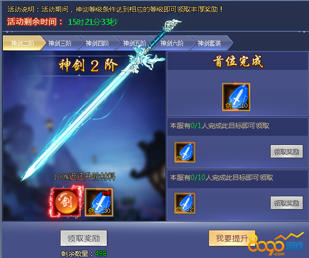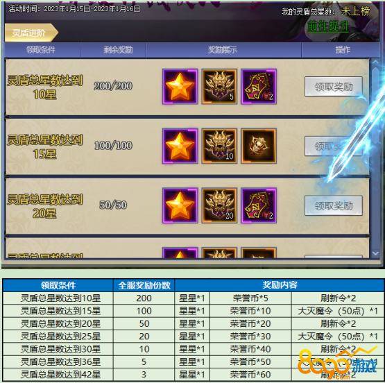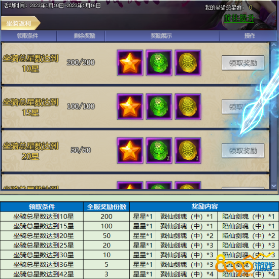 活动说明:神剑达到指定星数的玩家可领取对应奖励,数量有限先到先得!