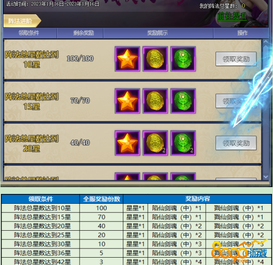 活动说明:阵法达到指定星数的玩家可领取对应奖励,数量有限先到先得!