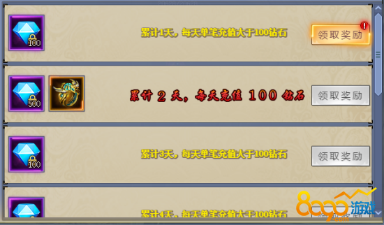 活动说明:活动期间连续充值满100钻石可积累天数,充值钻石达到相应数额,对应日期可获得指定奖励!