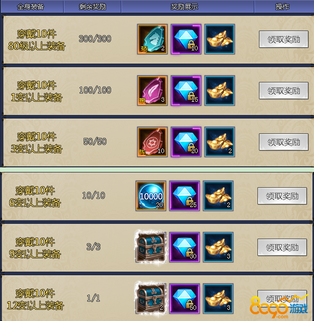 活动说明:活动期间收集指定等级的装备,即可领取对应丰厚大奖