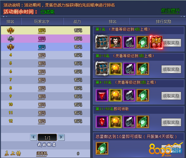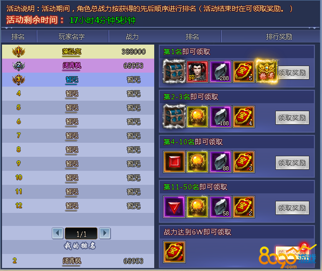 活动说明:活动期间,角色总战力按获得的先后顺序进行排名(活动结束时在可领取奖励。