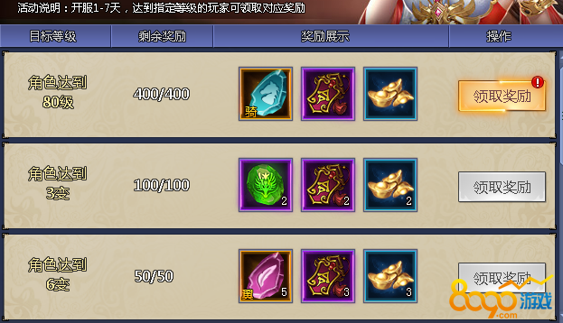 活动说明:开服1-7天,达到指定等级的玩家可领取对应奖励