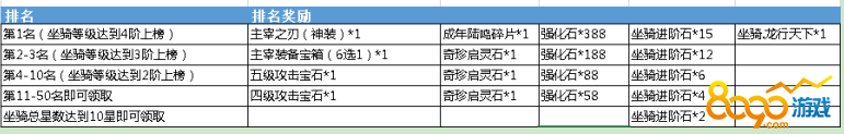 活动说明:活动期间,坐骑总战力按获得的先后顺序进行排名!